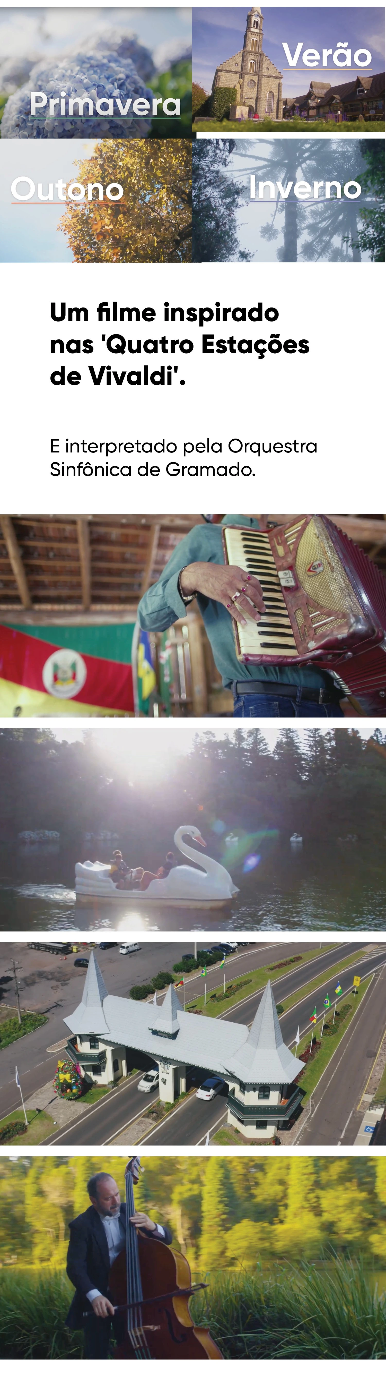 Com o conceito “Gramado de todas as estações“, o filme traz como fio-condutor a presença ilustre da Orquestra Sinfônica de Gramado interpretando as 4 Estações de Vivaldi, trilha musical gravada especialmente para o vídeo, deixando ele original e bem mais inesquecível. Além de diversos atores e atrizes locais, fomentando a diversidade de pessoas que a cidade recebe.